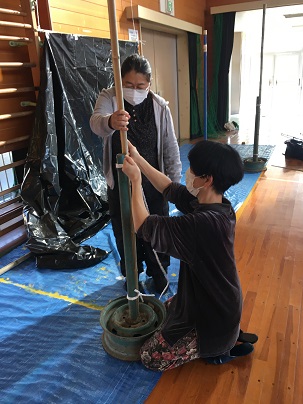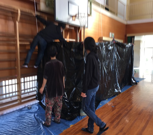 とりあえず、ブルーシート 支柱を立てて、 二階から、奥の壁のシートを吊るし、 支柱に手前の壁のシートを取り付ける お、形が出来てきた! シン山口ハロウィン お隣には、Y ちゃんが作ったネコ変身コーナー 天井と、出入り口も付きました。手前は、フォトスポット。 ハロウィンはすぴー居てます(^^♪ 入り口です。ここにシンウルトラマン。 キャラクター探しの答の一つ 「お化けの中に正義の味方」 中ちゃうやん・・いわれました。 会場はこんな感じ 明日の本番を待つステージ 作品も展示して、とりあえず、準備オーケー!! |
