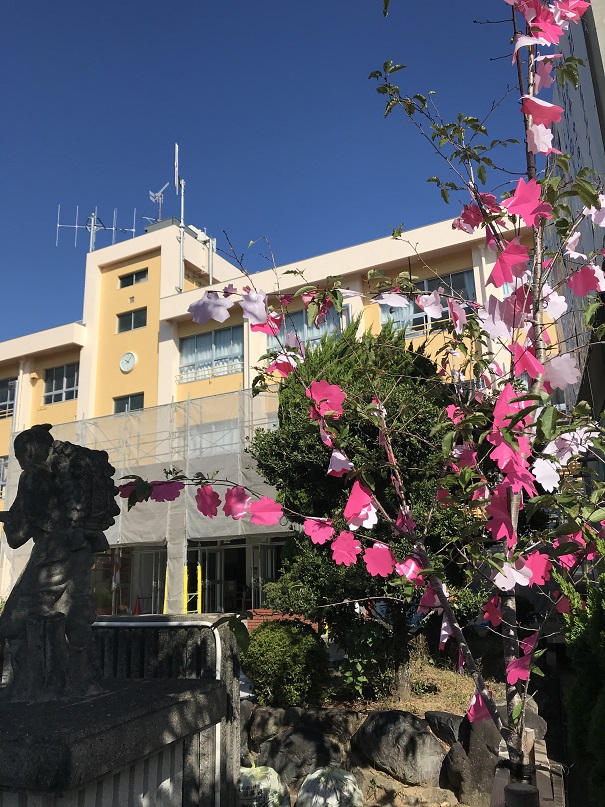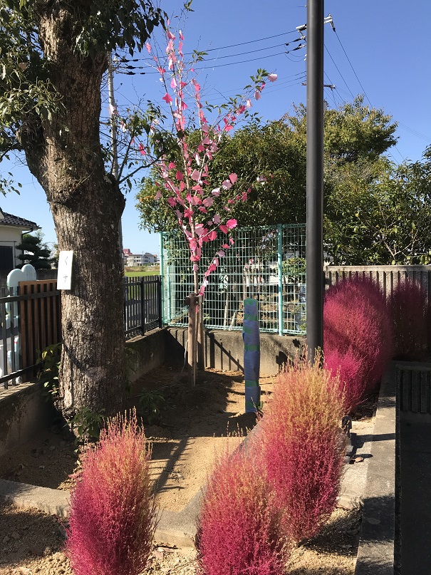 こどもたちと、地域の方で作ったお花で、山口小は、グッとおまつりムードに!! 桜の下には、ホウキ草(コキア)がショッキングピンクに紅葉しています(^^♪キレイ★