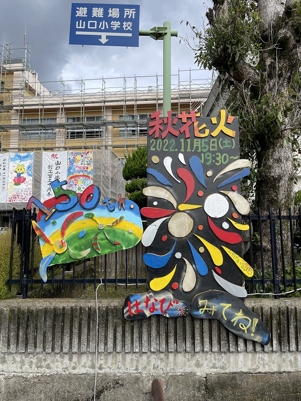 子どもたちに作ってもらった文化祭の看板と 花火の看板が設置されました!!