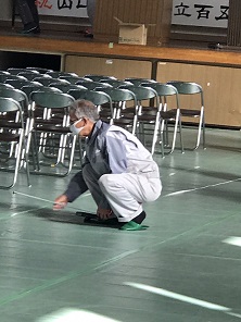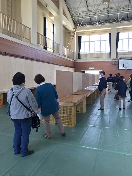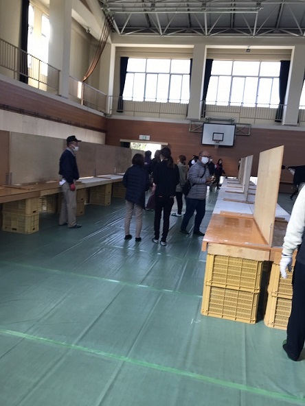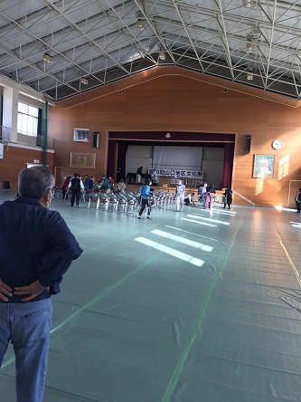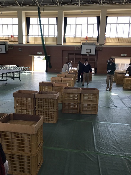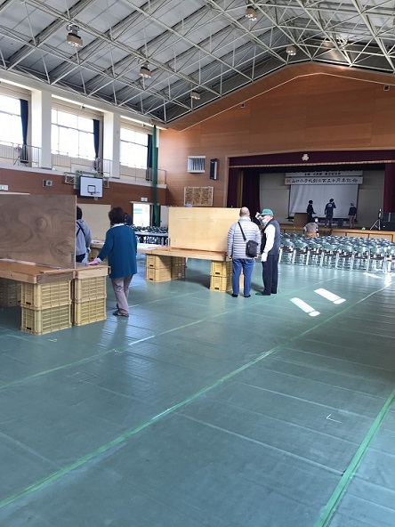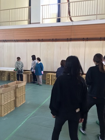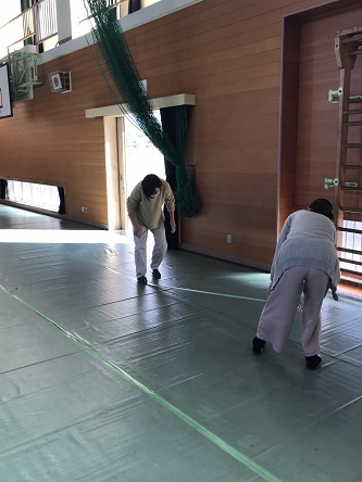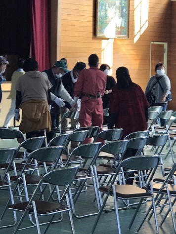 シートを敷き終わり、ガランとした会場に、いすを並べ始めます。