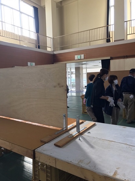 コンテナや、天板を運び込んで、展示台を作り始めます。
