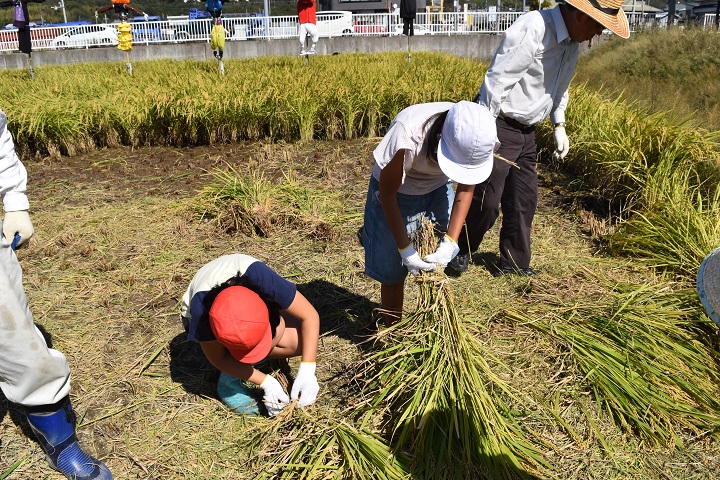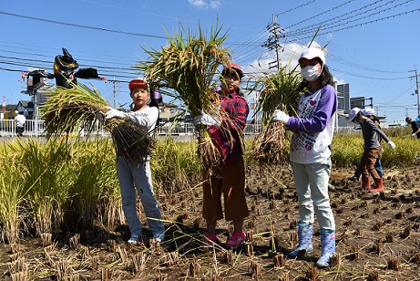 カカシが見守る中で稲刈り記念撮影 カマを使うのがとっても上手になります♪奪い合いです。 おいしいお米が出来たかな? |