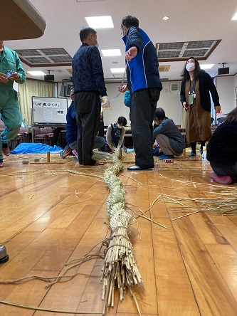 山口神社の5メートルのしめ縄。 みんなで協力して作ります。 子どもたちは、継ぎ足しのためのワラをガンガン叩いて手伝ってくれました!!