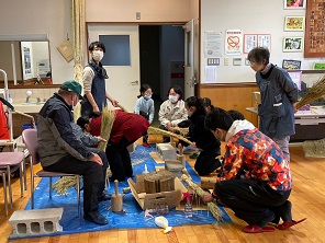 youtubeで見るような本格的なしめ縄台を まちづくり協議会のM氏が10個も制作!!! これは、いいしめ縄ができそうだ〜 早速おえかき広場でお試ししてみました。 これはイイ!! 押さえる人が要らないし、ワラも汚れず(^^♪ 倉庫などでの作業なら冷えないですね〜 本番が楽しみです!!